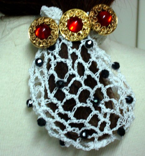The Detailed Description of Hand Crocheted White Rayon Cotton Gimp Small Dress Snood Trimmed with Black Beads Mounted on French Barrette with Three Antique Gold and Red Pearl ButtonsFeatures