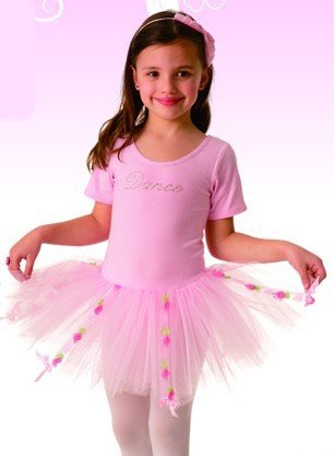 - Tights and Hair accessory sold separately. Bodice has "Dance" rhinestone embellishment; skirt has ribbon trim with small fabric "flowers". Color may be slightly lighter than pictured.