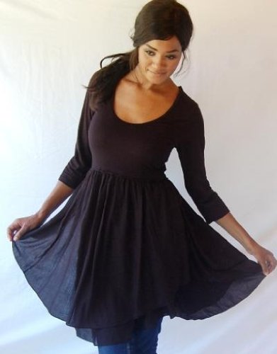 Annie's taken this babydoll-styled top up a coupla notches on the sophistication and fashion scales. First off, the classically-designed bodice, which has a self-trimmed scoop neckline and 3/4-length sleeves is done up in a stretchy and supportive spandex fabric that's sleek, smoothing and slenderizing, all the right things.Then she adds a double-layered skirt made out a semi-sheer rayon with a floaty, ephemeral quality that adds all kinds of magic. String ties allow you to create a more fitted look if you want.There's a hint of the ballet dancer here. A dash of innocence. And an understated, sophisticated elegance. This is just the right top to wear for either special occasions or casual occasions that you want to make more special. Annie's taken the 'babydoll' to a whole new level here. Enjoy.