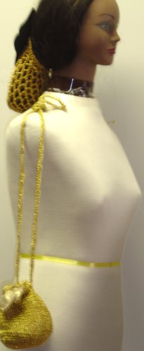 Hand Crocheted Gold Metallic Gimp Dress Snood with Black Velvet Bow for Women and Teens Offered with Hand Crocheted Gold Metallic Pocket Book with Gold Ribbon Bow and Button