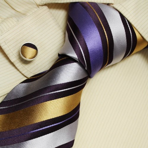 The Detailed Description of Purple Gold Striped Mens Dress Ties Gifts Ideas Discount Silk Neck Ties Cufflinks Set A1138Features