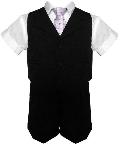 High Quality Tailored Made Vest Short SetThis set is perfect for Summer Weddings, and any special occasions.Brand new with tag, brand name designer 4 vest suit set, in dark black, with high quality Lavender Zipper Long tie.Included in this listing: * Black Vest with 2 welt pockets. * White Short sleeve dress Shirt. * Short Pants with cuffs. * Lavender Zipper Long Tie.The vest is fully lined with covered buttons on the front.The short pants come with elastic across the waist for easy fit.Please follow up with the measurements from the below size chart tofind your exact size. This set is available in Sizes Small, Medium, Large, XLarge 2T, 3T, 4T, 4, 5, 6, 7 All garments are brand new factory packed and come with hanger and cover bag. Please refer to the measurements provided on the size chart below for the exact measurement of the garments.