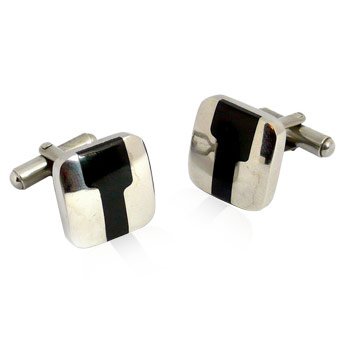Here's a set of post modern cufflinks manufactured with the highest quality stainless steel. This set features an embedded single piece of rich poured black enamel in a keyhole design. Why is stainless steel an excellent choice for cufflinks? Stainless steel is not poured into molds like jewelry manufactured with softer alloys like, platinum, goldtone or silver. Unlike traditional alloys, each stainless steel cufflink is hand-cut from a solid piece of steel leaving no seams, or weak spots. Life is short, so enjoy the best it has to offer. Cufflinks arrive in high-quality protective presentation box. Nice heavy weight speaks to their quality. Made with stainless steel so they never need to be polished. Great for wedding parties!