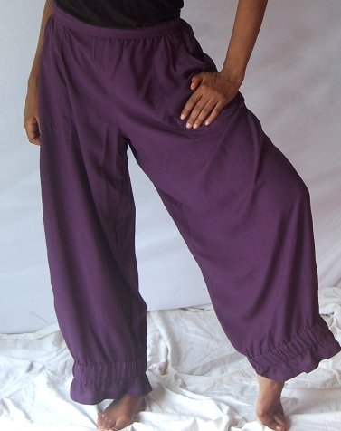 Let's face it, we women are very selective about the pants we wear. We like them to slenderize our waists, smooth our curves and lengthen our legs. And be comfortable at the same time. Stylish, too.Luckily for us, the designer here at Lotustraders is a woman who "gets it." Annie's pants are flattering and comfy, too. And when it comes to style, your remarkably affordable pants will be at the cutting edge of fashion just like the model in the expensive version for ten times the cost.Annie's latest pants have a comfy elasticised waist, very wide and flowing legs, rectangular patch pockets (Yippee!) with curved hand openings and the most adorable detailing at the ankles.A wide band of loose encased elastic pulls the fabric in just a bit and creates a sort of soft ruffle at the hem. The style is feminine, casual, elegant and oh-so sophisticated. It fits perfectly into the lagenlook category, but it looks good with just about everything.Made up in a solid color rayon with a delicious softness and an extraordinary flow. Wash it in cold water, drip dry and you're set to go.These pants pretty much do it all. Well, they won't scrub the kitchen floor or do the laundry. Not yet. But Annie and the crew here at 'Lotus' are probably working on it.
